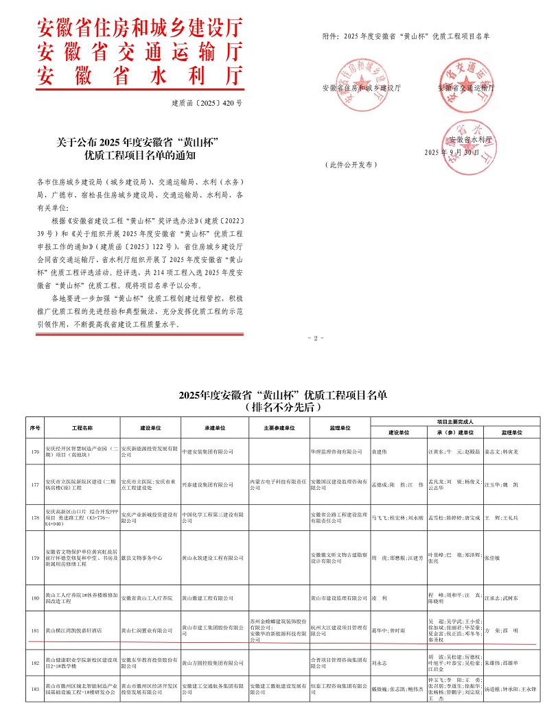 近日,安徽省住房和城鄉(xiāng)建設(shè)廳、安徽省交通運(yùn)輸廳、安徽省水利廳聯(lián)合公布了2025年度省“黃山杯”優(yōu)質(zhì)工程項(xiàng)目名單,黃山市建工集團(tuán)承建的黃山橫江灣凱悅嘉軒酒店項(xiàng)目成功入選,榮膺安徽省建設(shè)工程質(zhì)量最高榮譽(yù)——“黃山杯”獎。